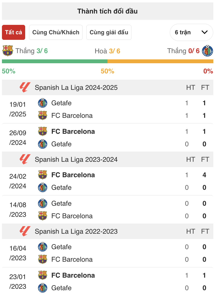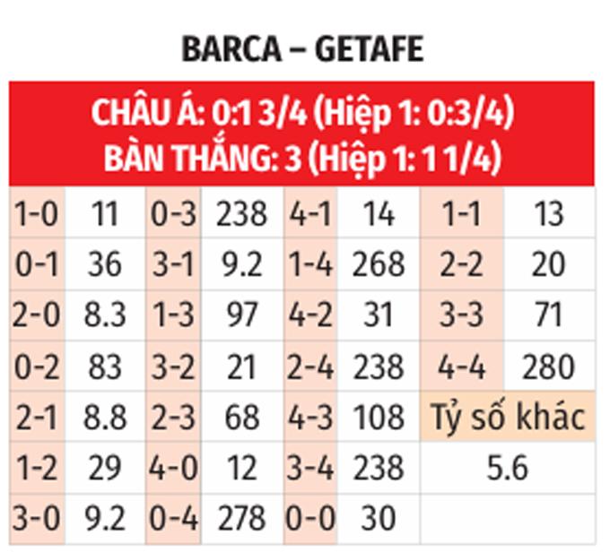 Trong khi đó, Getafe thắng 3/7 trận gần nhất khi xa nhà. Ngoài ra, đẳng cấp và thành tích đối đầu vượt trội của Barca trước Getafe trong thời gian gần đây (thắng 5, hòa 4) là điểm tựa để tin rằng đội chủ nhà sẽ có 3 điểm ở trận này.
