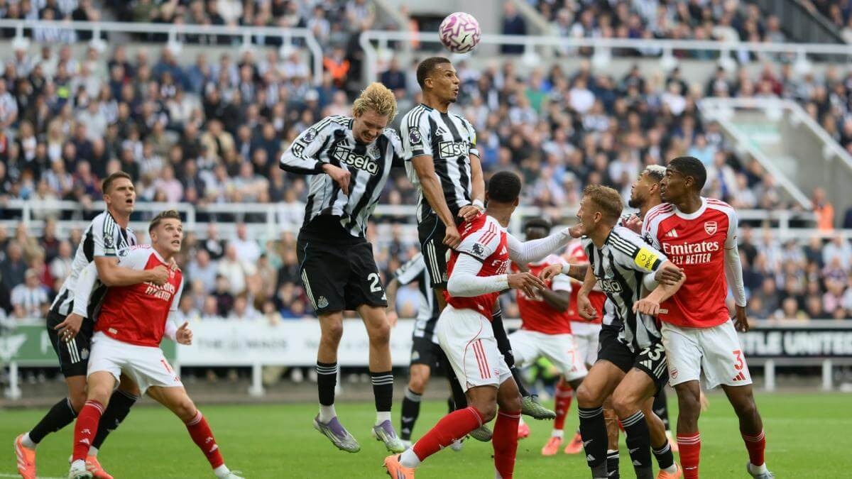 Hai cầu thủ Newcastle tranh nhau bóng trong một pha phòng ngự ném biên từ Arsenal.